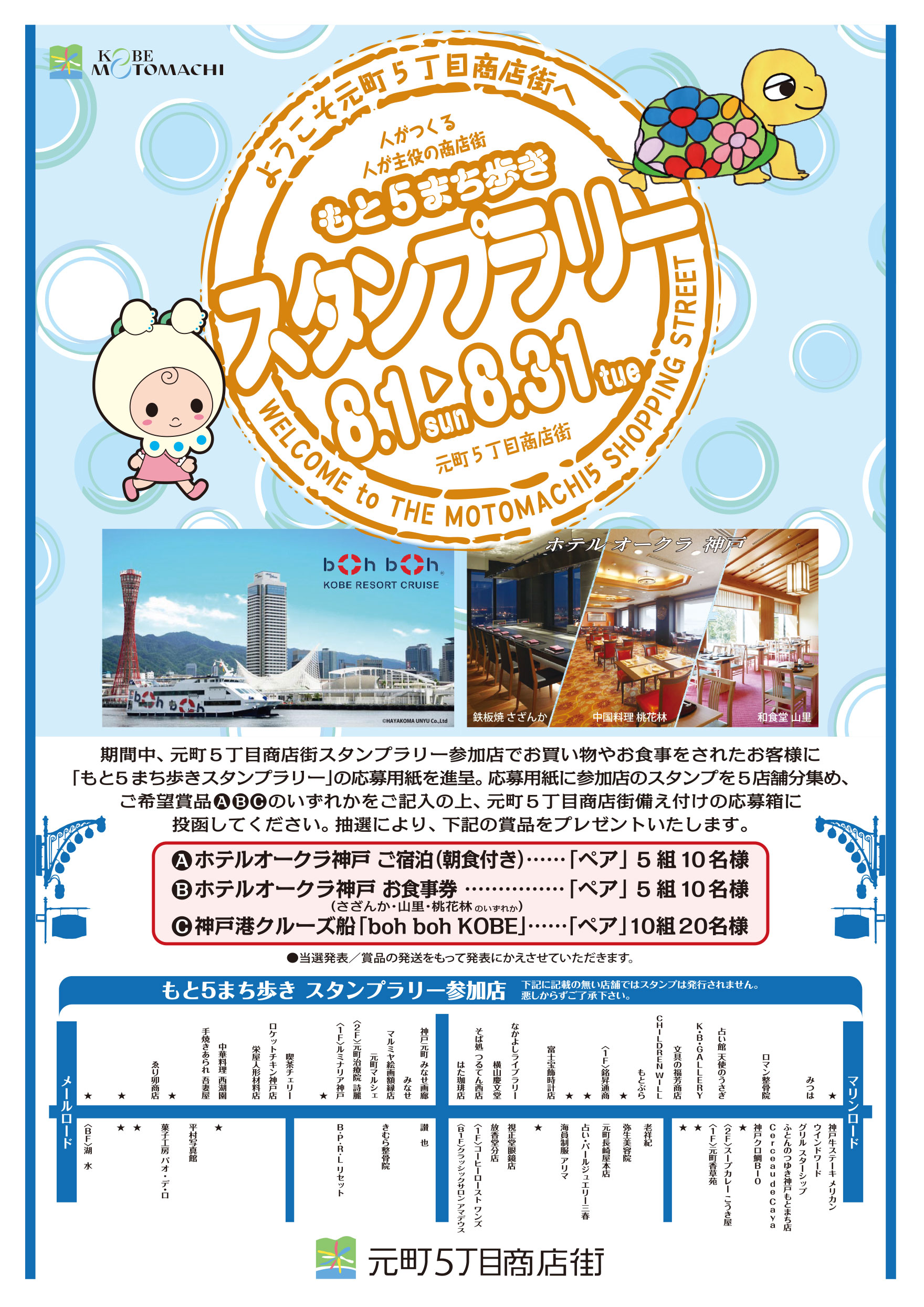 期間中、元町5丁目商店街スタンプラリー参加店でお買い物やお食事をされたお客様に「もと5まち歩きスタンプラリー」の応募用紙を進呈。
